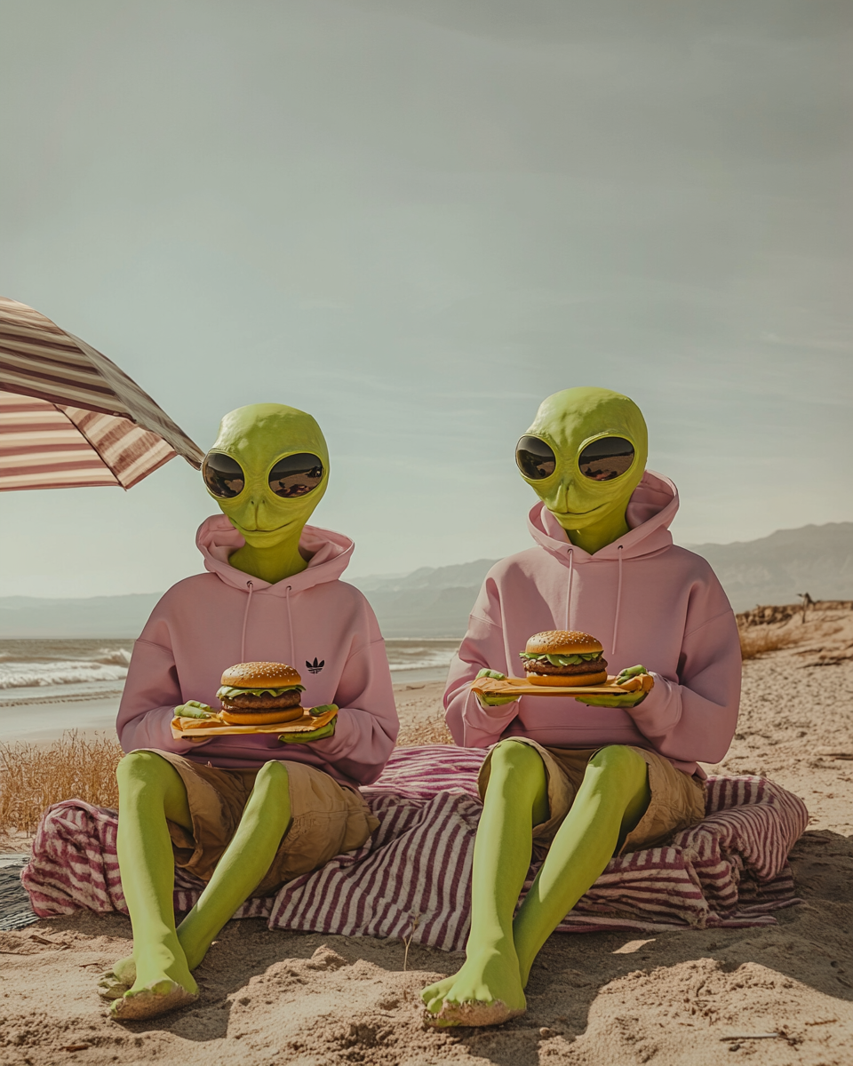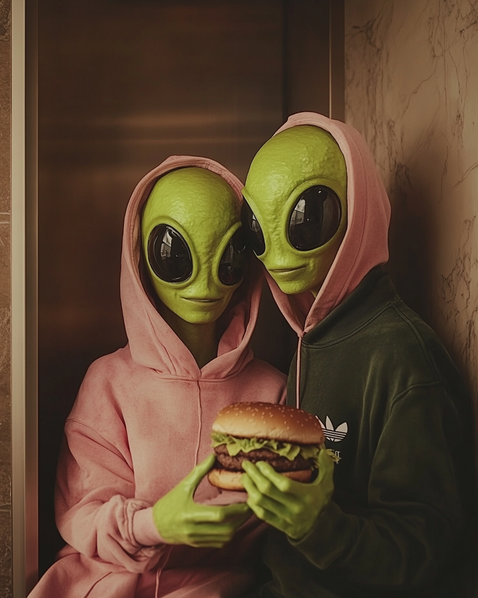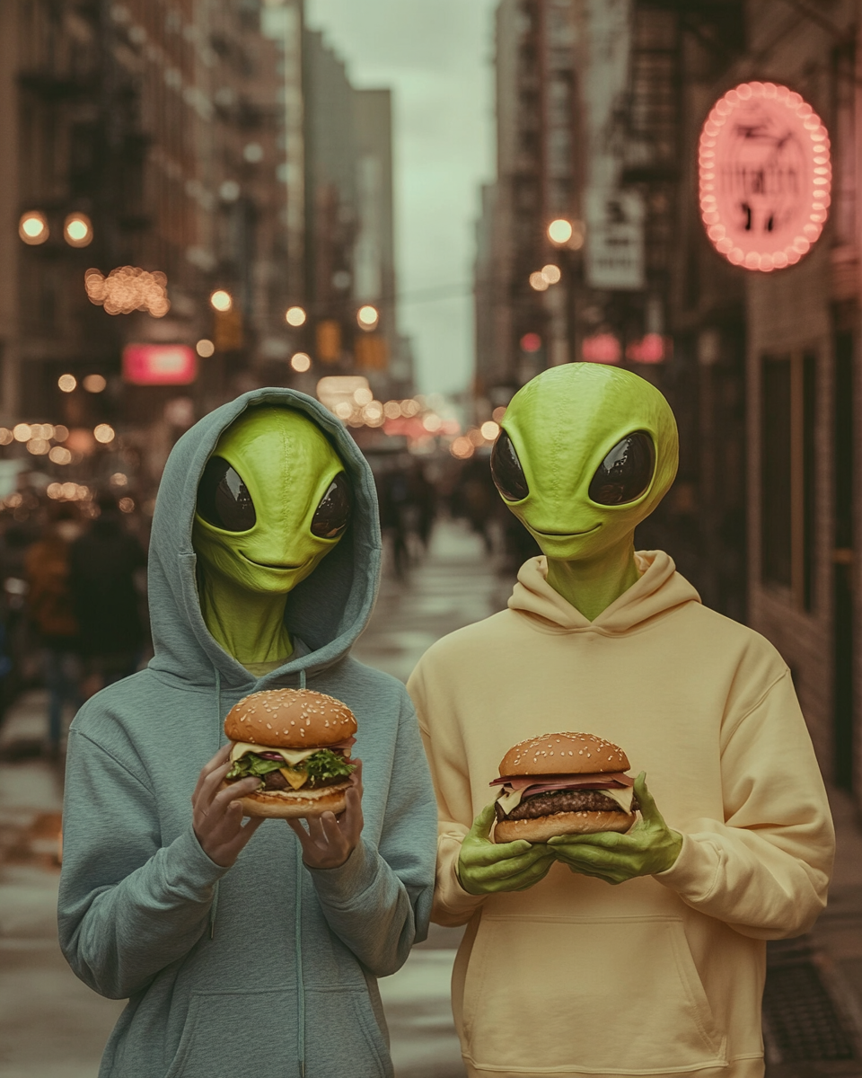 The brand is built on the idea that aliens live among us, perfectly integrated into everyday life, yet united by an irresistible obsession: burgers. The contrast between ordinary situations and subtle surreal details creates humor and positions the product as something truly extraordinary—“not from this world.