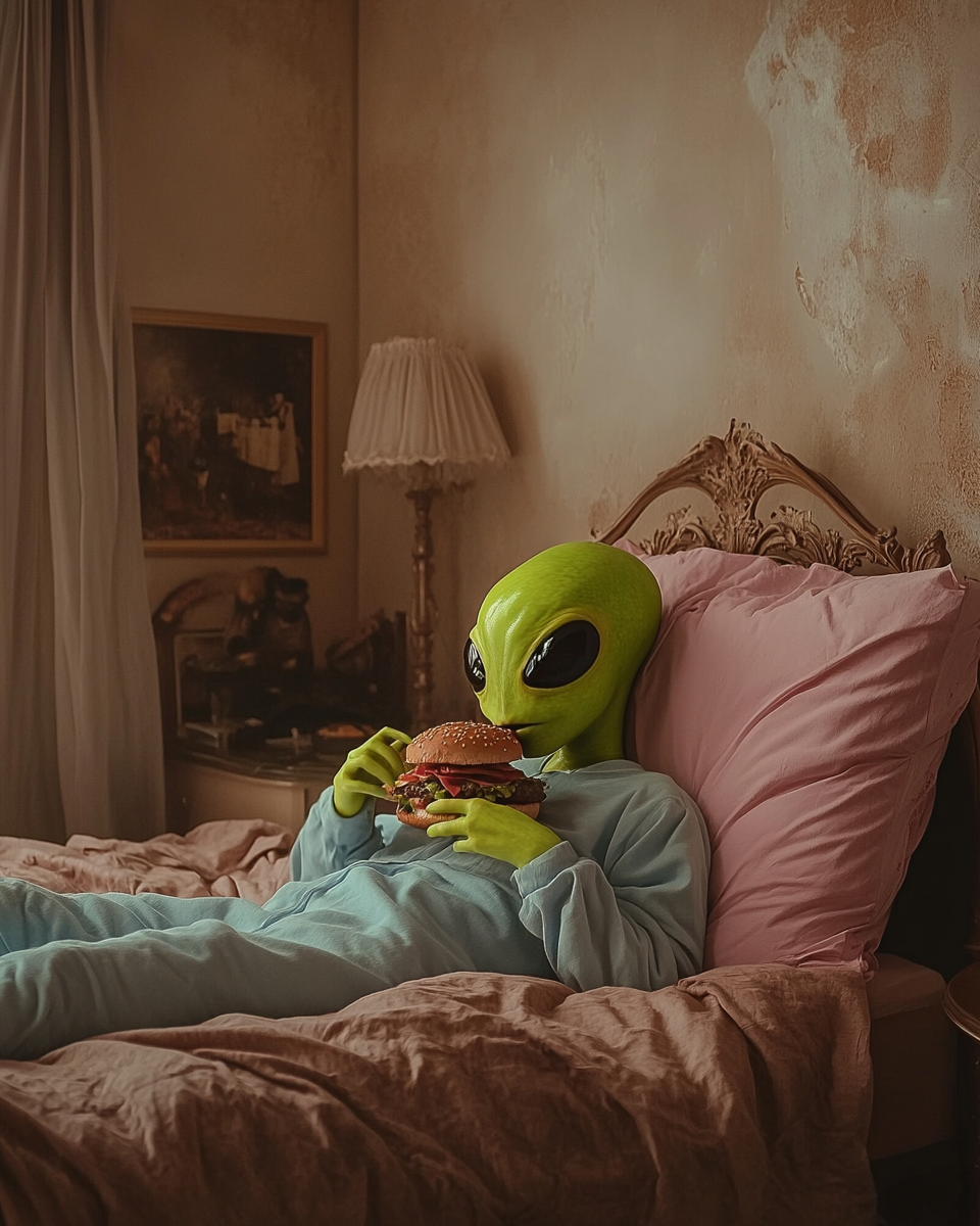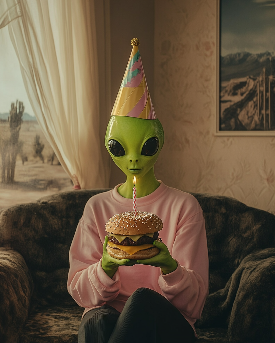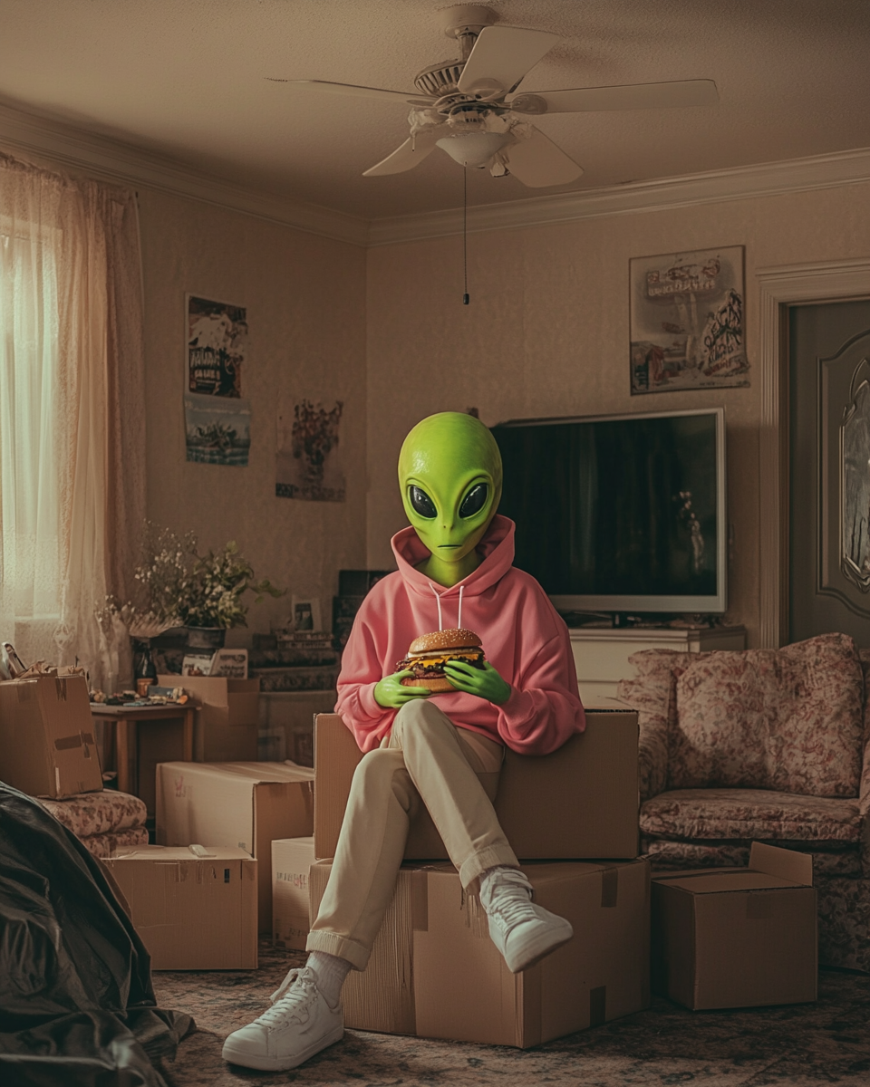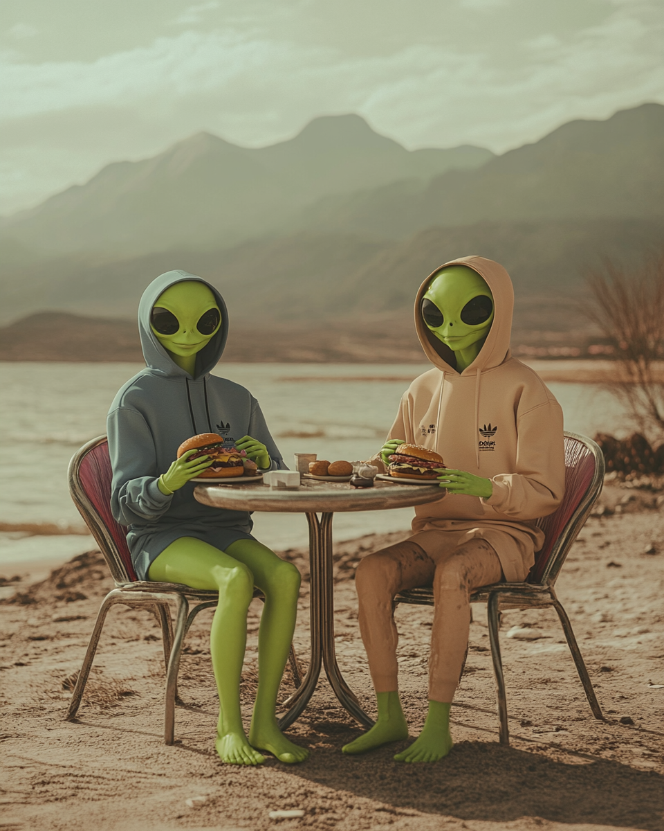 The brand is built on the idea that aliens live among us, perfectly integrated into everyday life, yet united by an irresistible obsession: burgers. The contrast between ordinary situations and subtle surreal details creates humor and positions the product as something truly extraordinary—“not from this world.