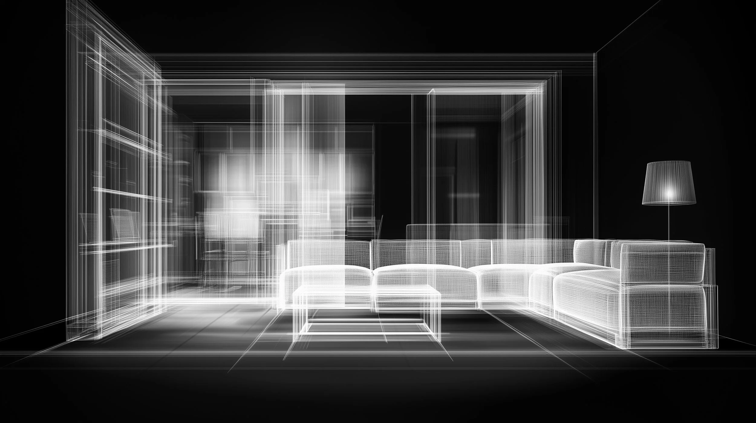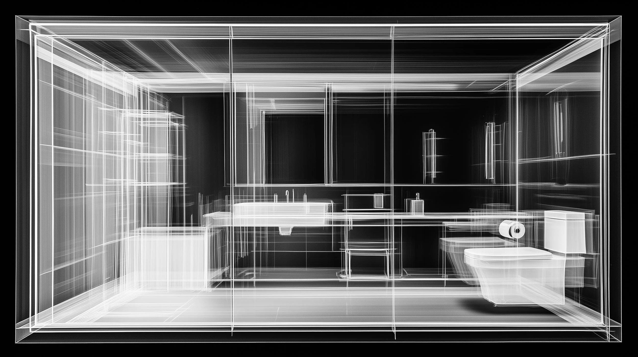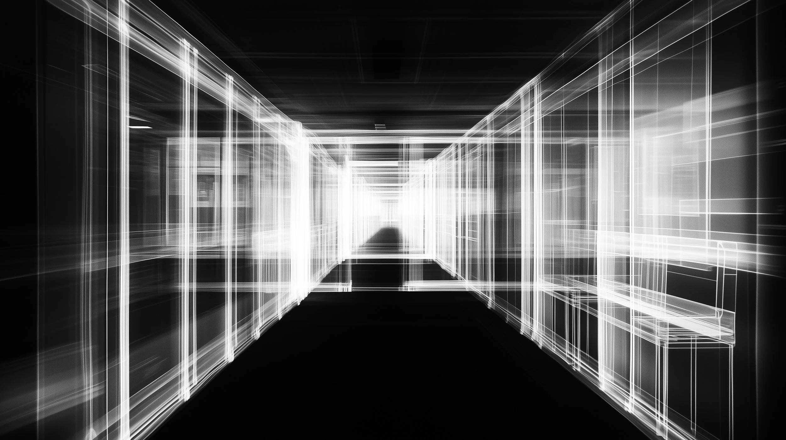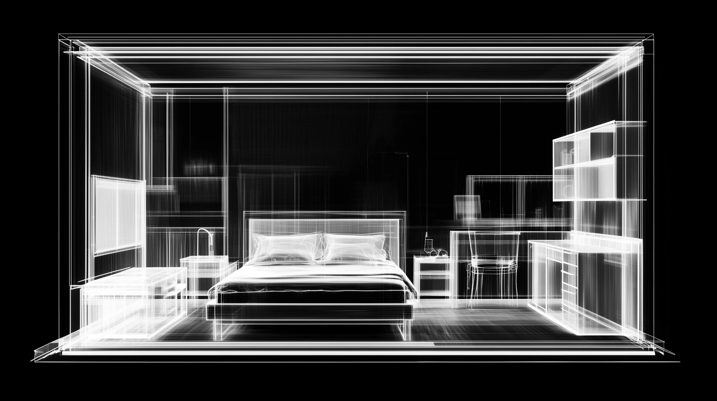 Geometry: Sharp structures, cold angles, and lines that outline the “flesh” of the space, just like in a radiograph.