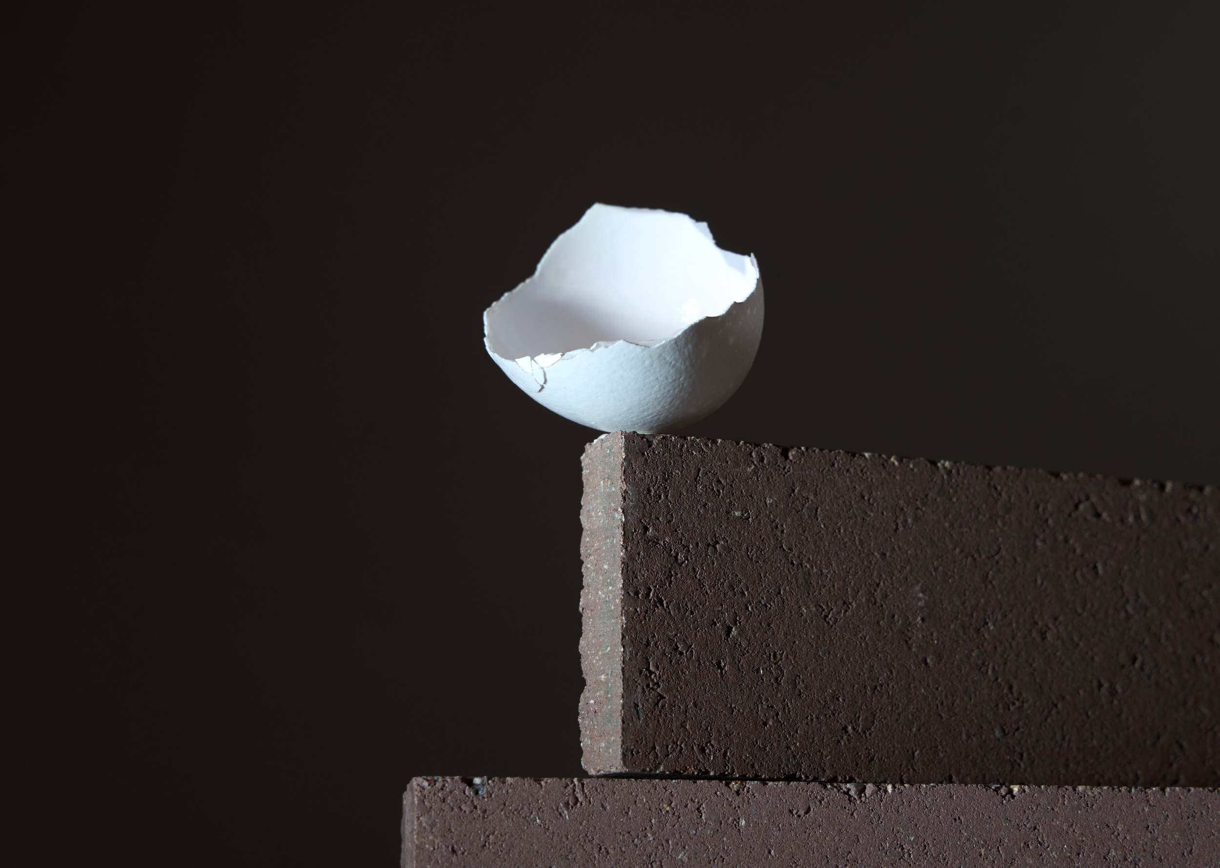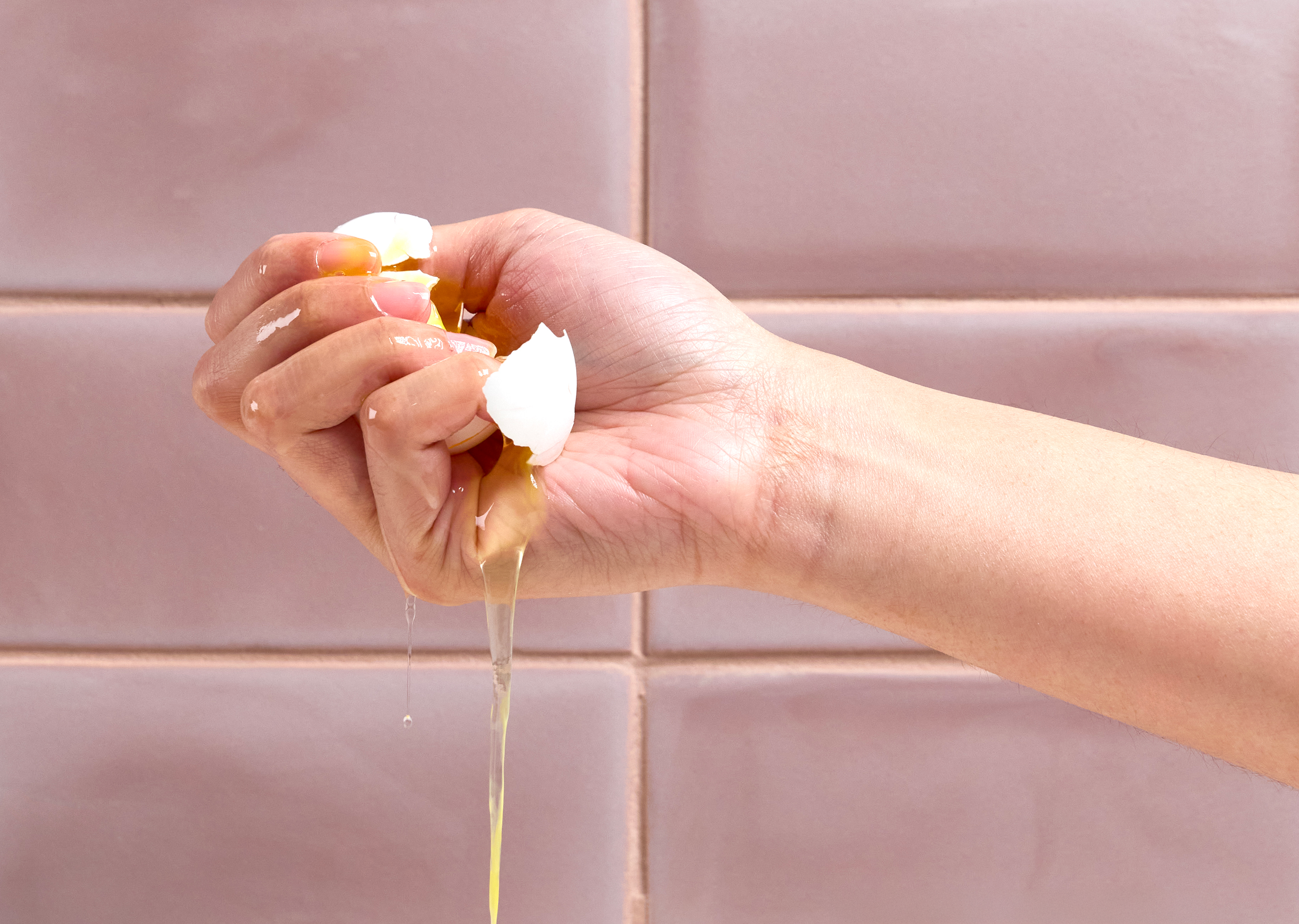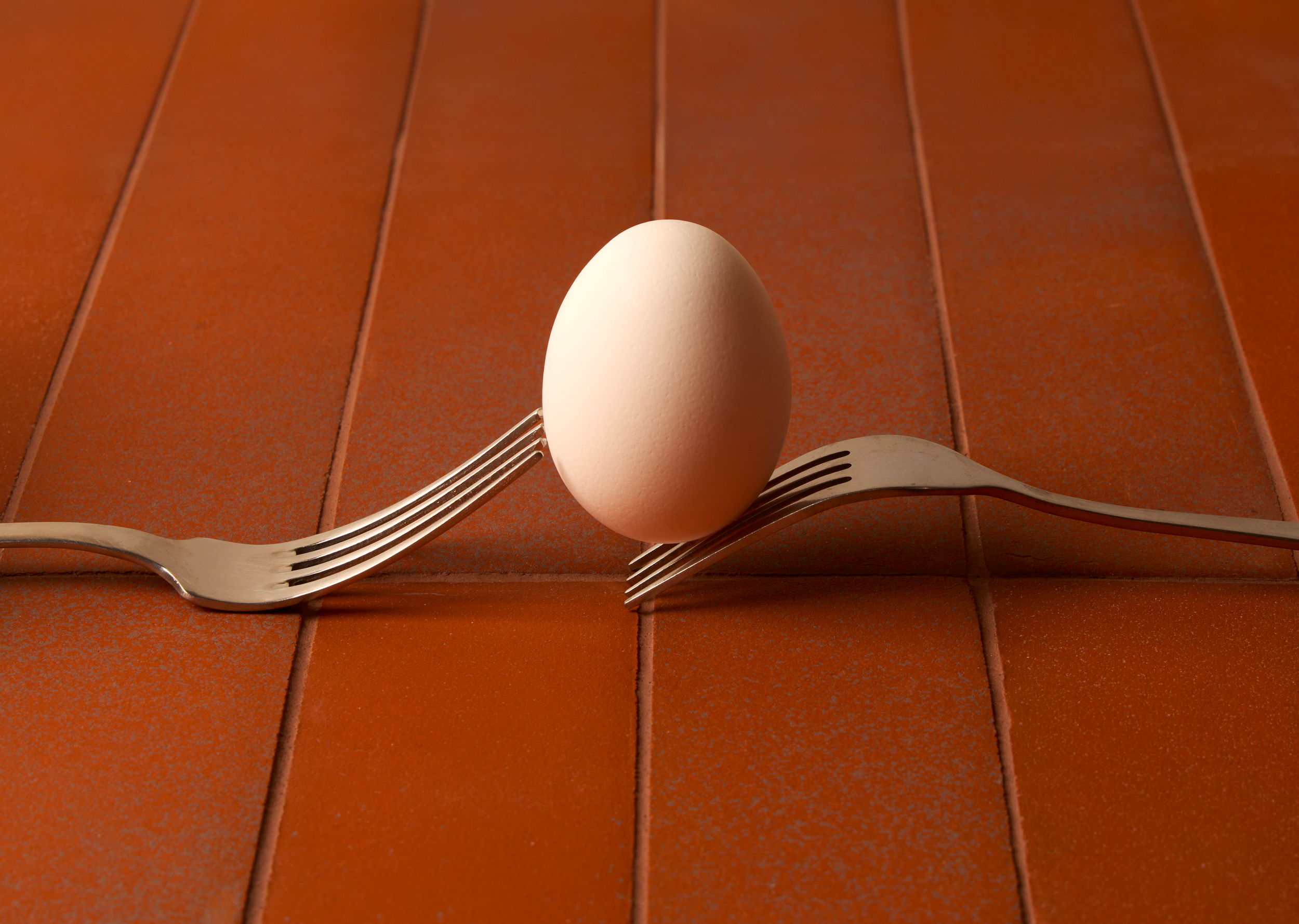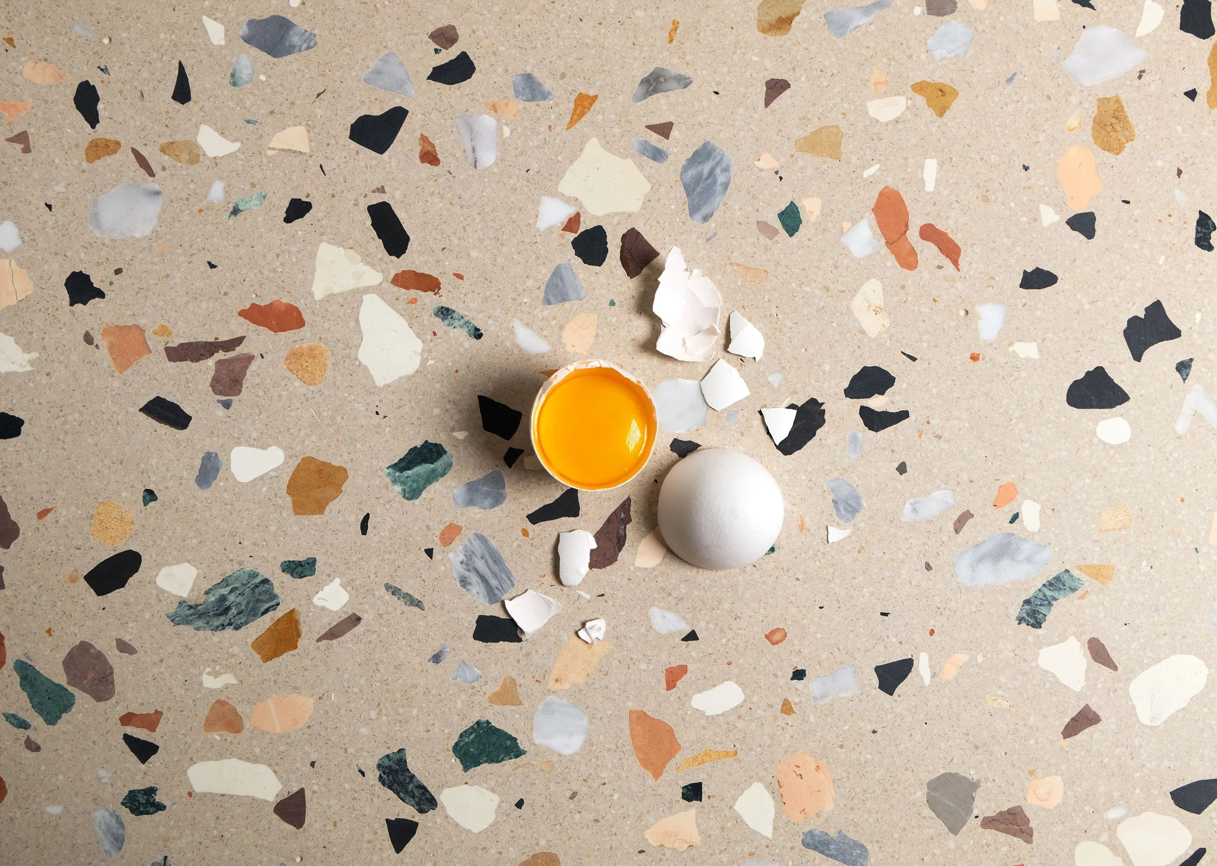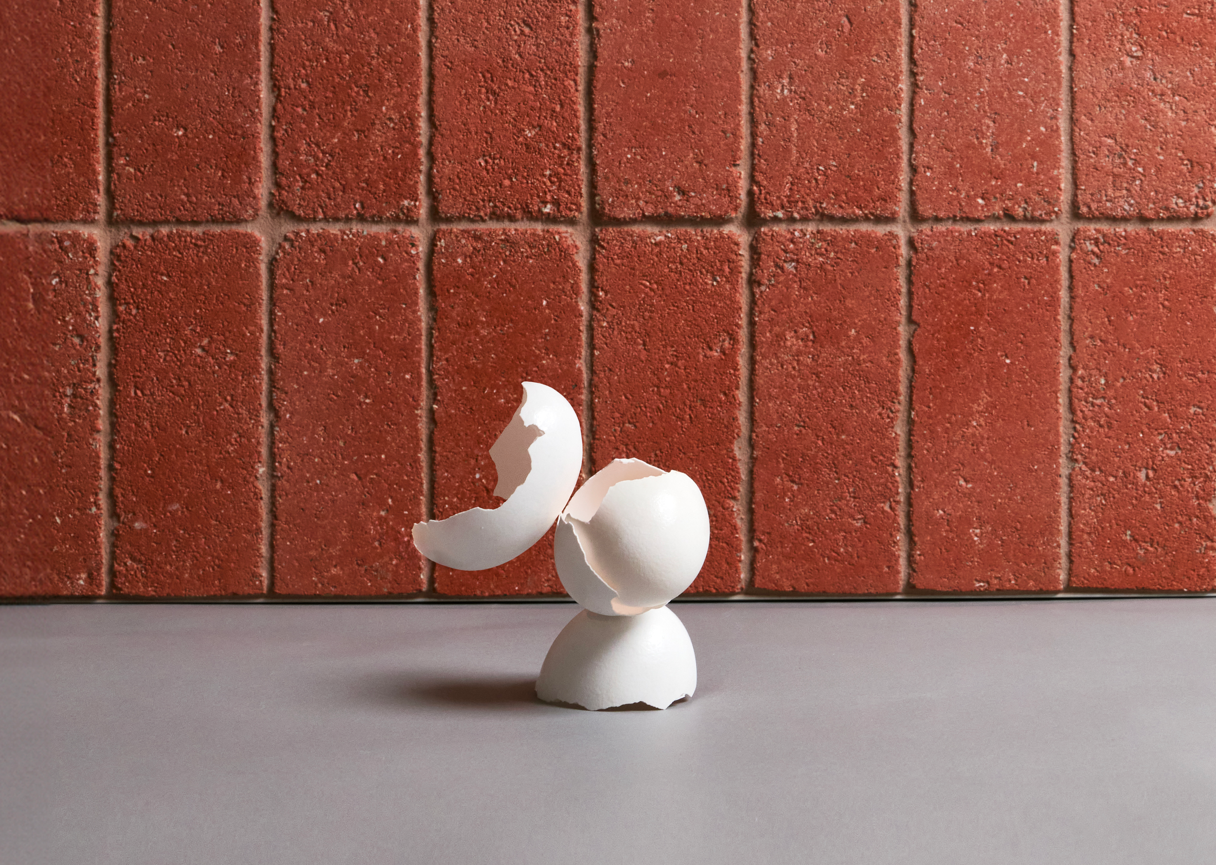 In the shoot, the egg is used as a metaphor for transformation and new identity. Placed alongside ceramic surfaces, it evokes the idea of matter evolving and taking shape, just like a space being renewed.